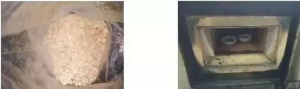 调研过多家医药化工企业RTO炉,发现大部分企业RTO炉在运行一段时间后,蓄热床层底部有二次污染物大量积聚(如图2)、黏附现象,易造成蓄热床层底部堵塞,引发火灾等安全事故。以某医药企业为例,经过取样试验分析发现,该二次污染物具有以下特性: